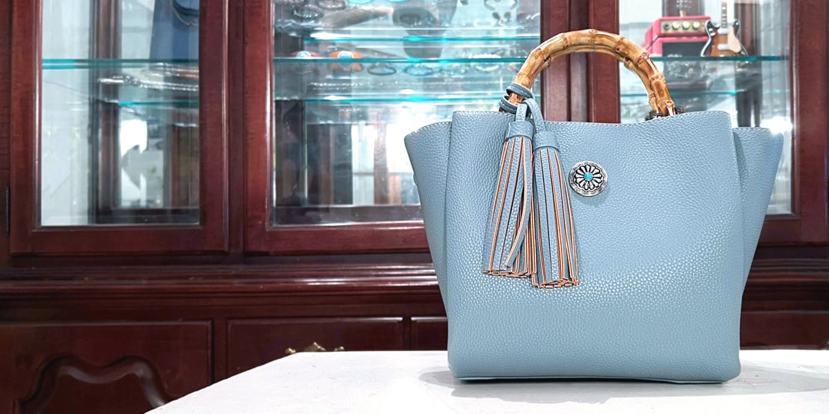 合成シュリンクレザーと天然バンブーのミニショルダートート(スモークブルー+ターコイズコンチョ) ☆数量限定品