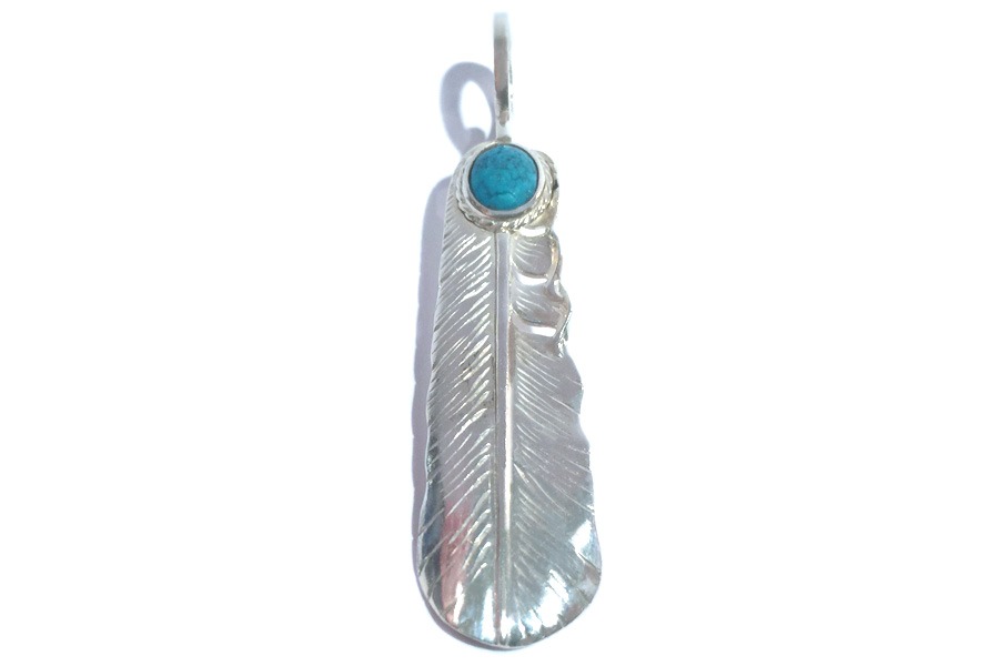 鳥の様に自由に、この空を飛びたい。そんな思いから製作した、今にも飛び立ちそうな羽根のペンダントヘッドです。銀の縄目の枠の中に、極上のターコイズをマウント。全体に柔らかな丸みを帯び、どこか優しい風合いの羽根です。