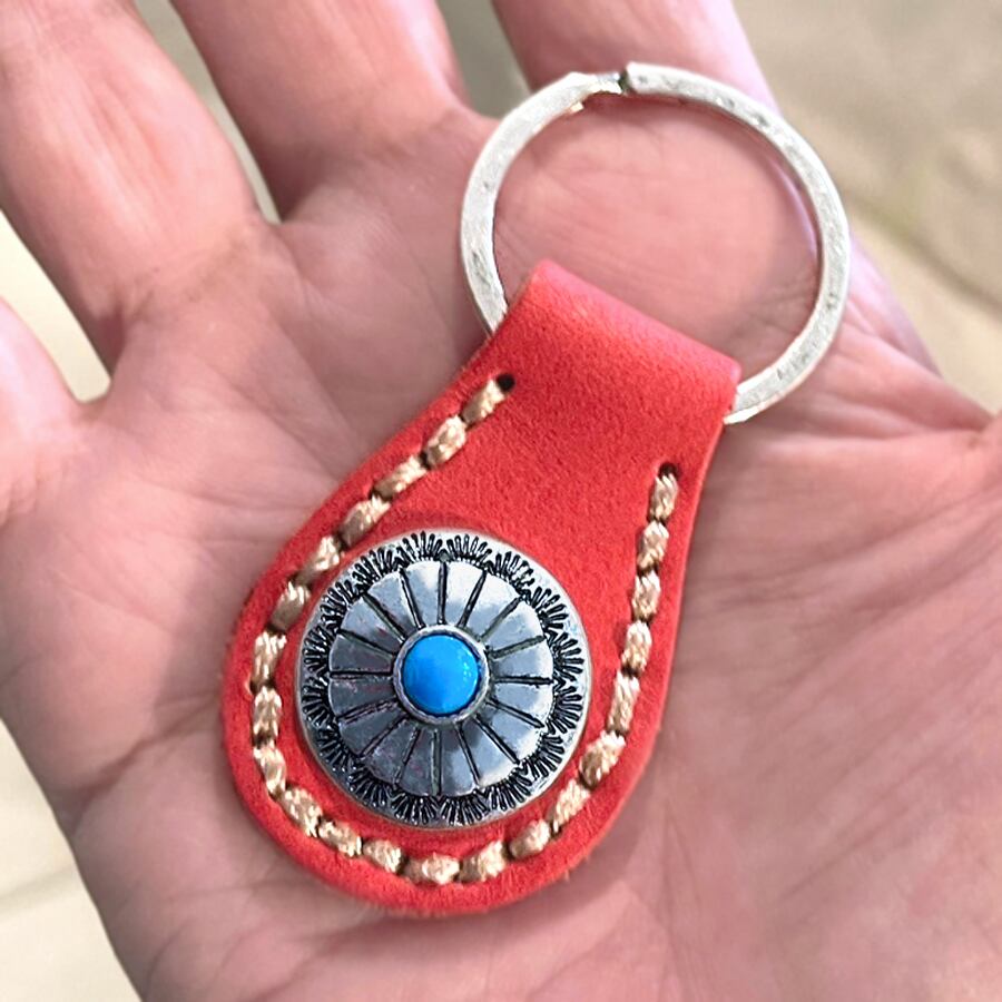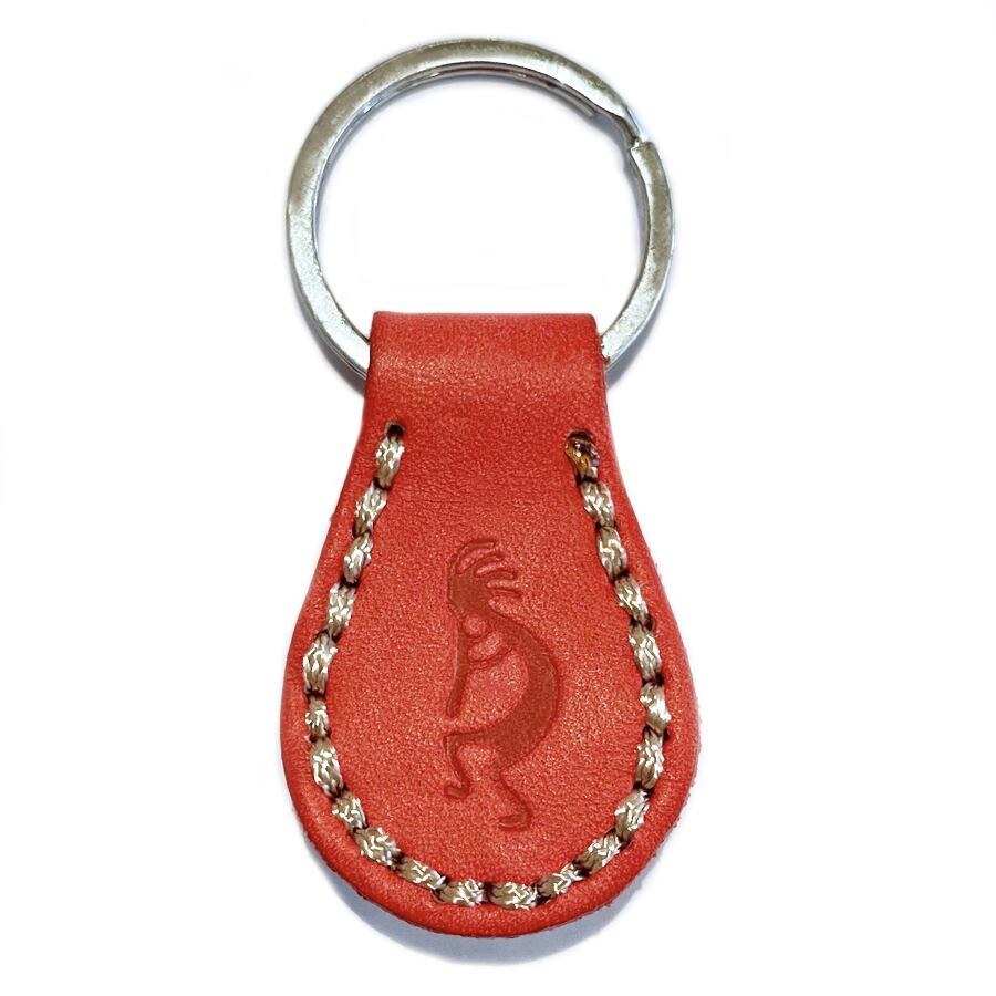 頑強な牛革サドルレザーの本体に、フラワーコンチョを留めました。手のひらサイズで使い勝手の良い、キーリングです。背面には、ココペリの大きな刻印を。笛を吹きながら踊るココペリは、ネイティブアメリカンにとって幸運や豊作の精霊です。古くから岩絵にも描かれて来た、幸せの象徴です。本革製のキーリングは、お使い頂く程に色が深まり、風合いを増します。育てる感覚で、日々使い込んで下さい。