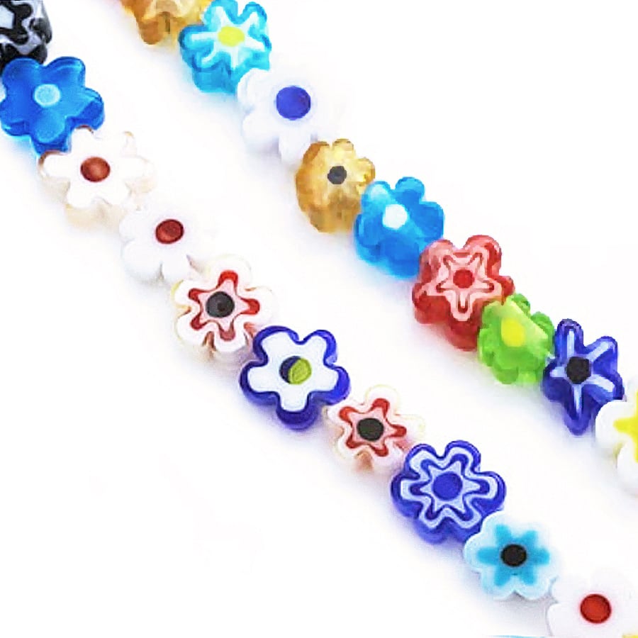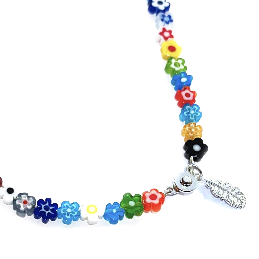 イタリアンガラス ミルフィオリ(千の花)を贅沢に用いた、華やかで上品なネックレス。ガラスを何層にも巻き付け金太郎飴の様な棒状にし、それをカットして行く事でフラワーモチーフのビーズが出来上がります。沢山の花の粒が出来上がる事から、ミルフィオリ(イタリア語で千の花)と呼ばれます。これは、イタリアの伝統的な技法です。ハンドメイドのガラスビースには、優しい温もりがあります。中でも、特に厳選したミルフィオリだけを使用。直径6mm前後なので、程良い存在感です。金属部分は全て、上質のスターリングシルバーを使用。ワイヤーには、ナイロンコーティングを施したステンレス鋼の編み込みロープを用いております。短期限定受注製作にて、お届けしています。