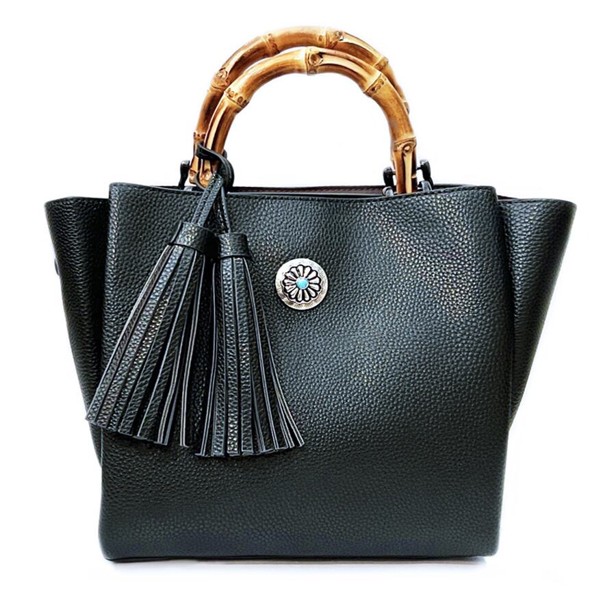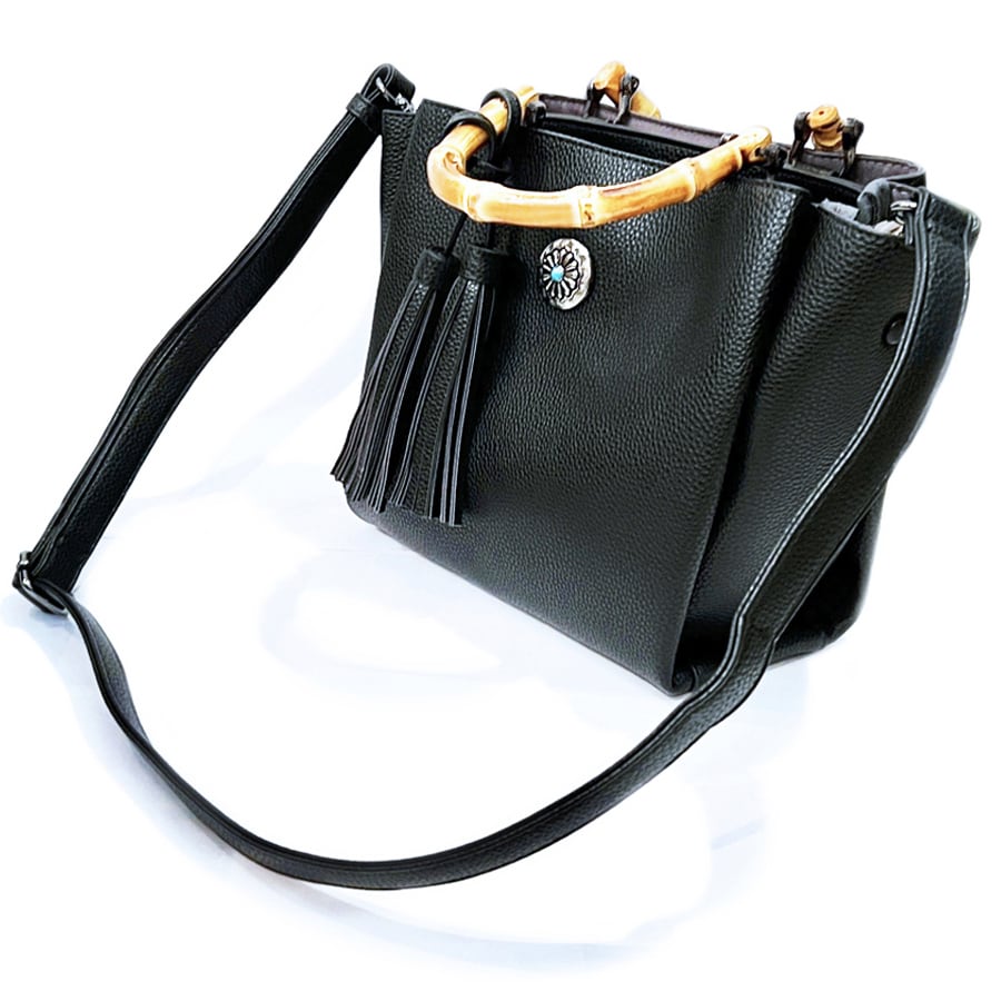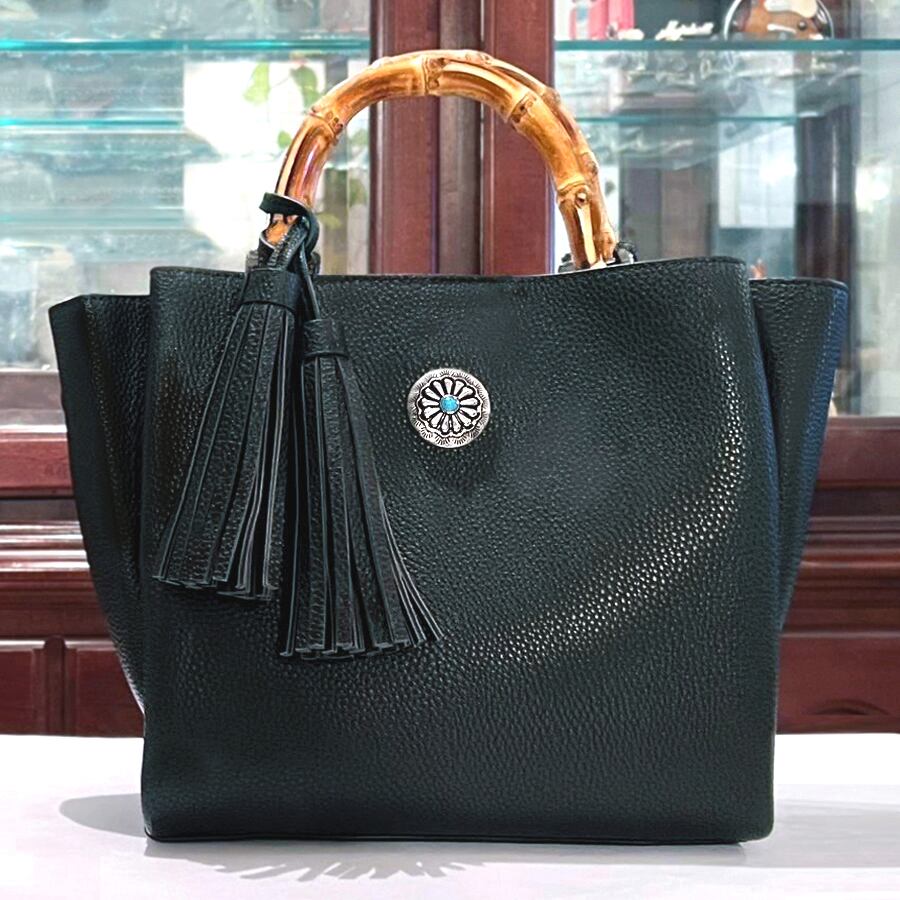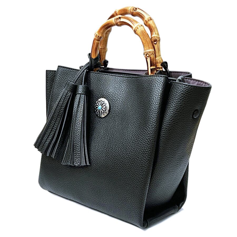 合成シュリンクレザーと天然バンブーのミニショルダートート(ブラック+ターコイズコンチョ) ☆数量限定品