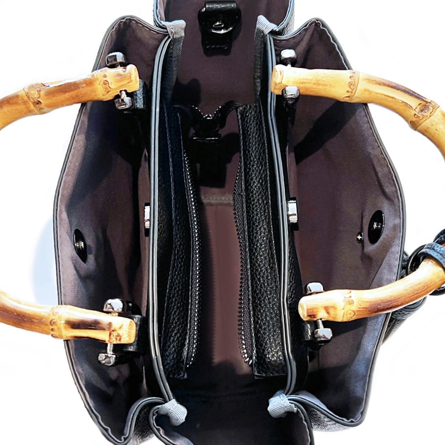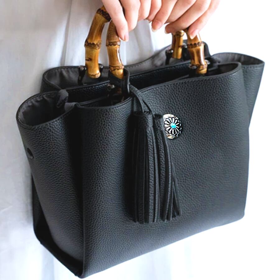 合成シュリンクレザーと天然バンブーのミニショルダートート(ブラック+ターコイズコンチョ)