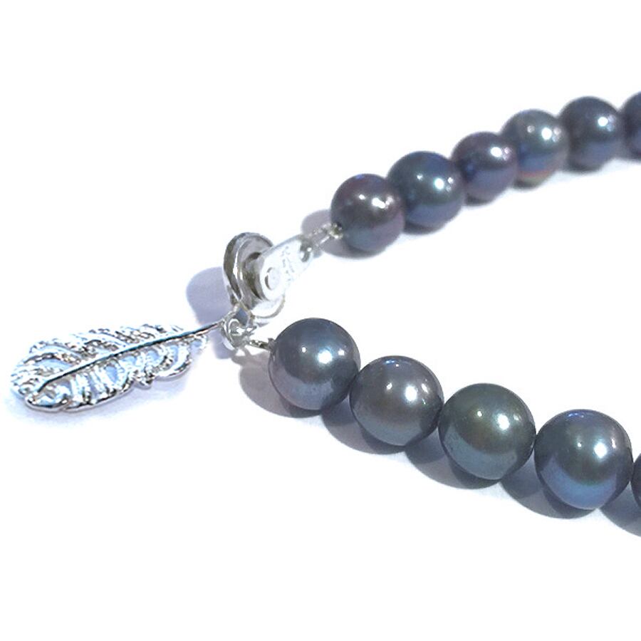この本真珠の照りも見事なもので、上品な華やかさがあります。湖で育った淡水パールは芯まで真珠層で出来ているため、大変丈夫です。淡水パールは邪気をはらい、災いを跳ね返す強い力があるとされます。毎日を幸せに過ごせる様、環境を整えてくれる効果もあります。金属部分は全て、上質のスターリングシルバーを使用。ワイヤーには、ナイロンコーティングを施したステンレス鋼の編み込みロープを用いております。
