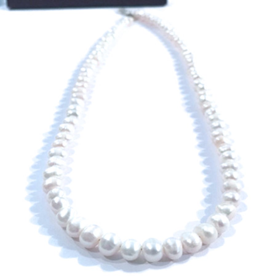 この本真珠の照りも見事なもので、上品な華やかさがあります。湖で育った淡水パールは芯まで真珠層で出来ているため、大変丈夫です。淡水パールは邪気をはらい、災いを跳ね返す強い力があるとされます。毎日を幸せに過ごせる様、環境を整えてくれる効果もあります。金属部分は全て、上質のスターリングシルバーを使用。ワイヤーには、ナイロンコーティングを施したステンレス鋼の編み込みロープを用いております。