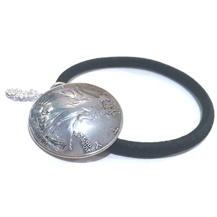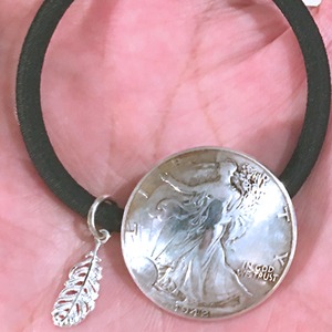 この銀貨は1930~1940年代にアメリカで製造された高純度(おおよそ95%)のもので、刻まれた文字は LIBERTY = 自由。ローマ神話に登場する自由の女神、大きな花束を抱え朝日に向かって歩く姿が、リアルに描かれています。昔からアンティークコインは災厄を防ぐお守りとされて来ましたが、自由を取り戻す為のお守りとして蘇らせました。コインを木槌で叩き湾曲させ、コンチョ形状に加工しています。羽根のチャームも取り付けました。ヘアゴムとしてもお使い頂けます。