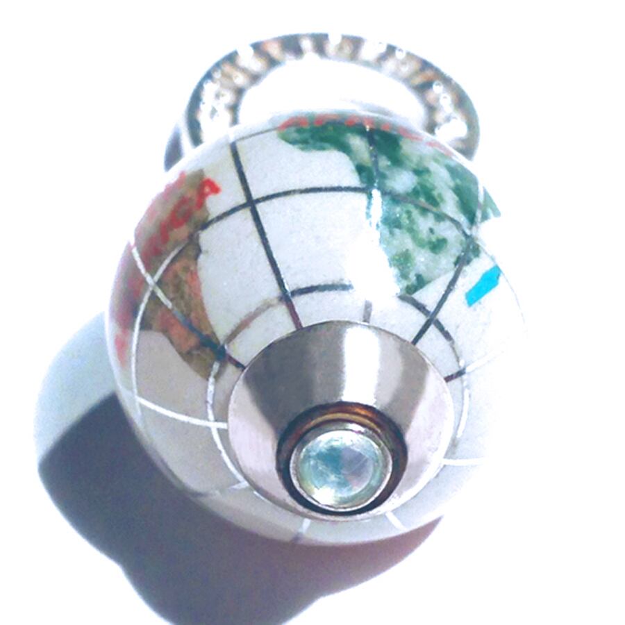 首から下げているだけでロハスな、天然石の地球儀ペンダントです。地球の海の部分にはホワイトターコイズを、陸地部分は瑪瑙(メノウ)や翡翠(ヒスイ)や貝(ムーンシェル)で製作しています。南極部分には銀のリベットを打ち込み、大きなホワイトサファイアを石留めしています。熟練職人による、宝飾の作り込みです。スローライフの、お供にも。