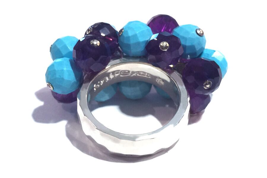 上質のアメジストとターコイズを、贅沢に使用しました。天然石がゴロゴロと揺れる様がゴージャスでもあり、チャーミングでもあります。しっかり感のある本体には、柔らかなハンマー打を施しました。リングの内側まで手仕事で丹念に仕上げ、まるで皮膚に吸い付くかの様な仕上がりです。