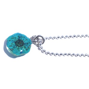 国内農場の小手毬をプリザーブドフラワーとし、小さく可憐な花の1つ1つを硬質樹脂でパックしました。表面に着色するのでなく、生花の状態で染料を吸い上げる事で染色しています。これにより花の自然な風合いを維持しており、色褪せる事も割れる事もありません。ゆったりとお使い頂ける、スターリングシルバーのカットボールチェーンが付属します。留具部分には、羽根のチャームを取り付けました。