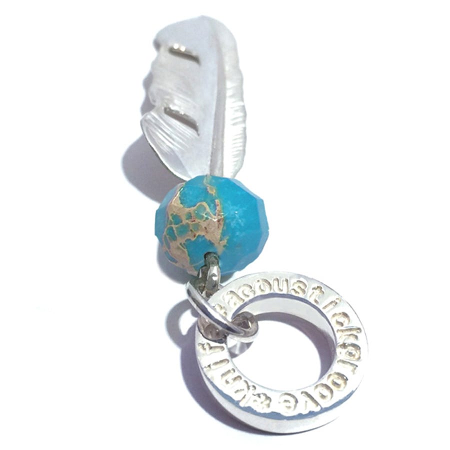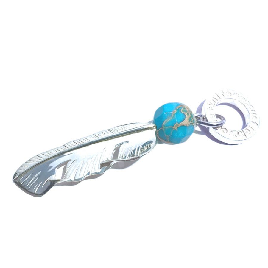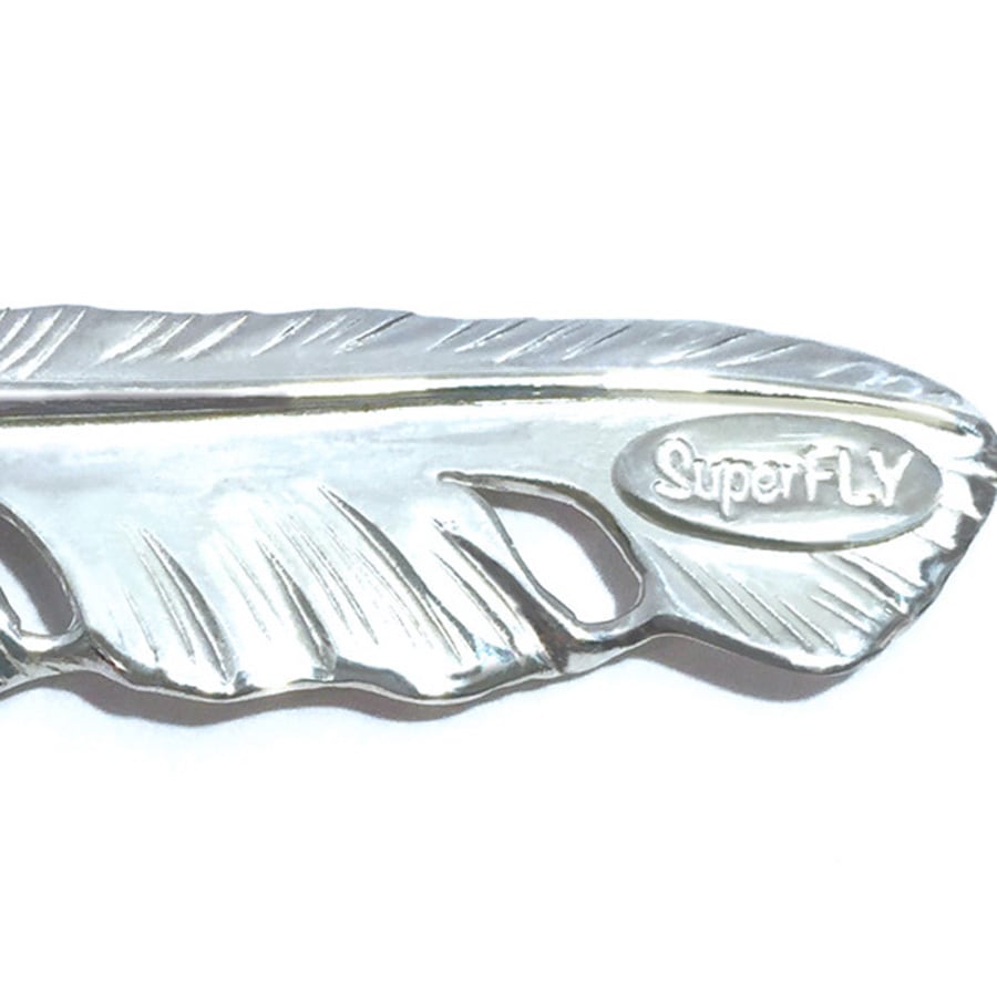 天然のターコイズを用い人工的に自然の表情を強く引き出して、力強く繊細な羽根にマウントしました。とても躍動感ある SuperFLY の羽根の造作は、ネイティヴアメリカンと共にトレーラーハウスで生活を続けた熟練の彫金師が担当しました。ターコイズは非常に明るいポジティブなエネルギーを放ち、ネガティブなエネルギーを払いのけ、困難を乗り越え願望を叶える為のサポートをしてくれます。シルクロードの時代から、旅のお守りともされます。