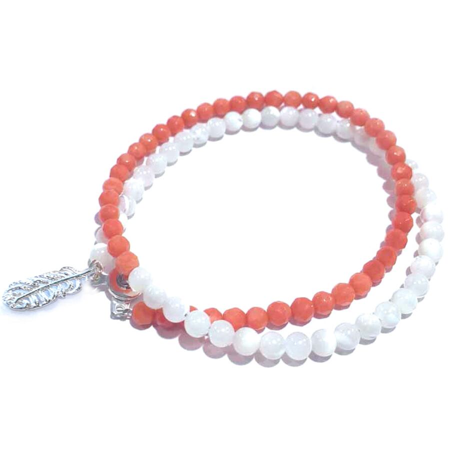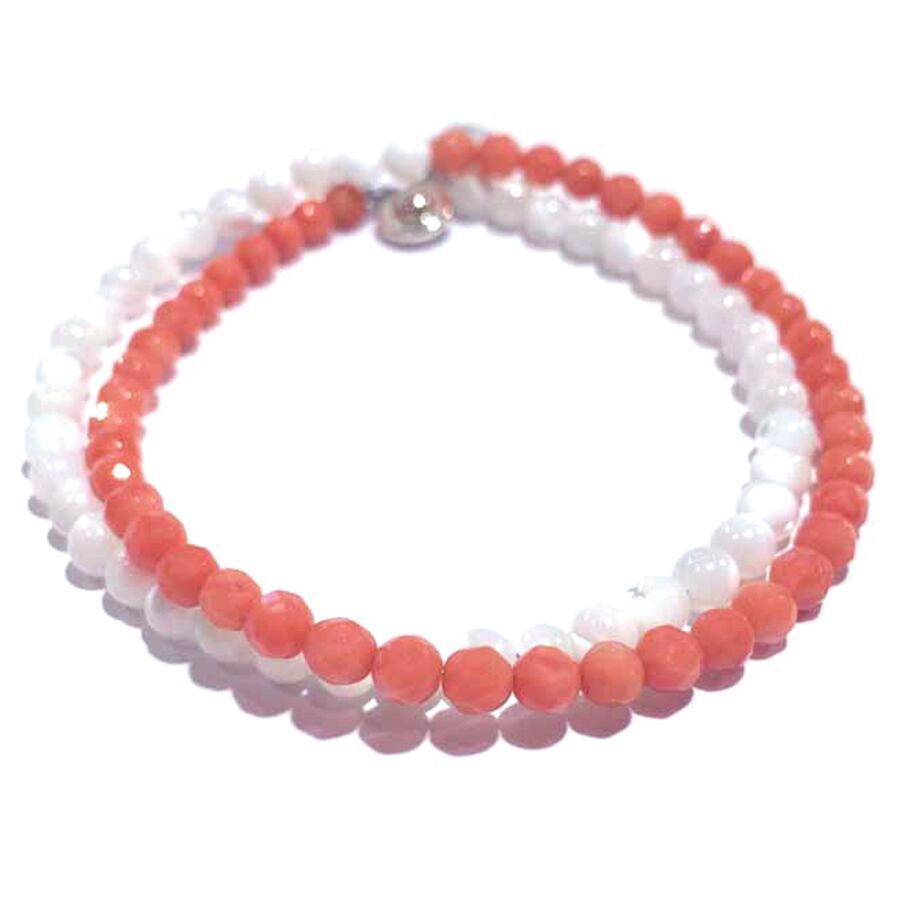 珊瑚と貝を用いた、ダブルのブレスレットです。見る角度によって、様々な表情をお楽しみ頂けます。金属部分には全て、上質のスターリングシルバーを使用しました。ワイヤーには、ナイロンコーティングを施したステンレス鋼の編み込みロープを用いております。