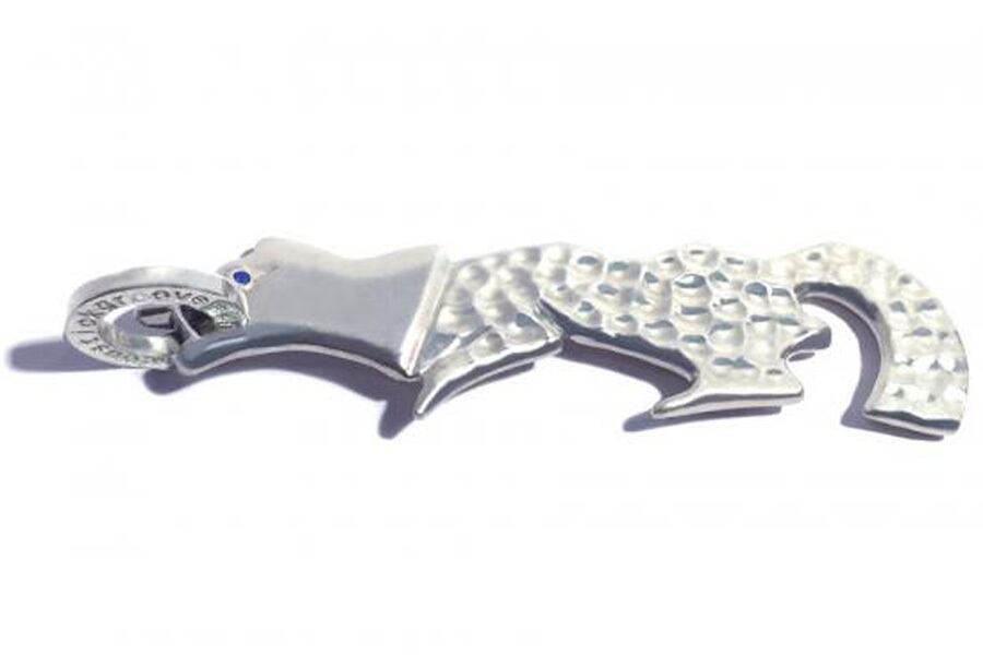 存在感のある、ニホンオオカミのペンダントヘッドです。外側と内側の目の部分にはサファイヤ(ルビー)を2石、丁寧に石留めしました。全体にハンマー打ちを施し、上品な表情が素敵です。ニホンオオカミは絶滅したと言われていますが、必ずどこかで生きていると信じています。人間ごときが近寄れない深くて遠いどこかで、必ず生き延びています。