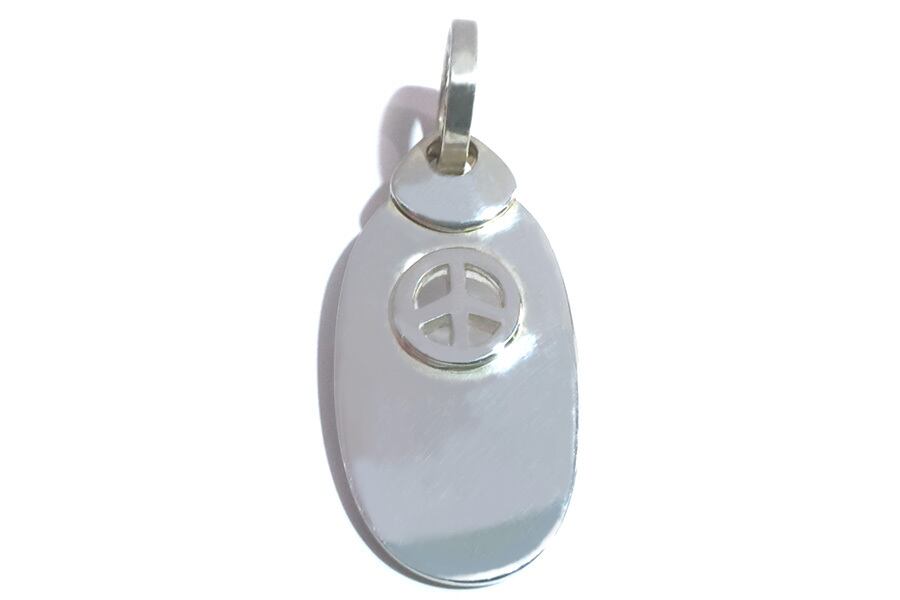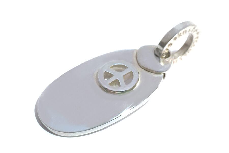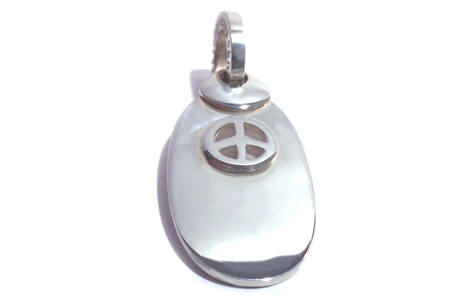 楕円プレートにピースマークリベットを打ち込んだ、存在感のあるペンダントヘッドです。3つのパーツから組み立て、リベット部分はスケルトンの仕上りとしました。