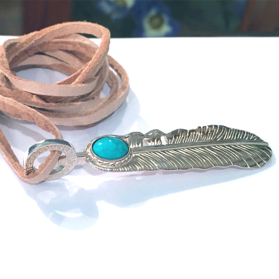 最大クラスの、羽根のペンダントです。とても躍動感ある SuperFLY の羽根の造作は、ネイティヴアメリカンと共にトレーラーハウスで生活を続けた熟練の彫金師が担当しました。銀の縄目の枠の中に、宝飾クラスの天然ターコイズをマウント。全体に柔らかな丸みを帯び、どこか優しい風合いの羽根です。ターコイズは非常に明るいポジティブなエネルギーを放ち、ネガティブなエネルギーを払いのけ、困難を乗り越え願望を叶える為のサポートをしてくれます。シルクロードの時代から、旅のお守りともされます。宝飾クラスの美しい天然ターコイズは、欧州ラグジュアリーブランドでも多用されています。