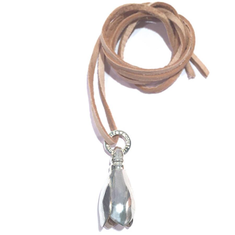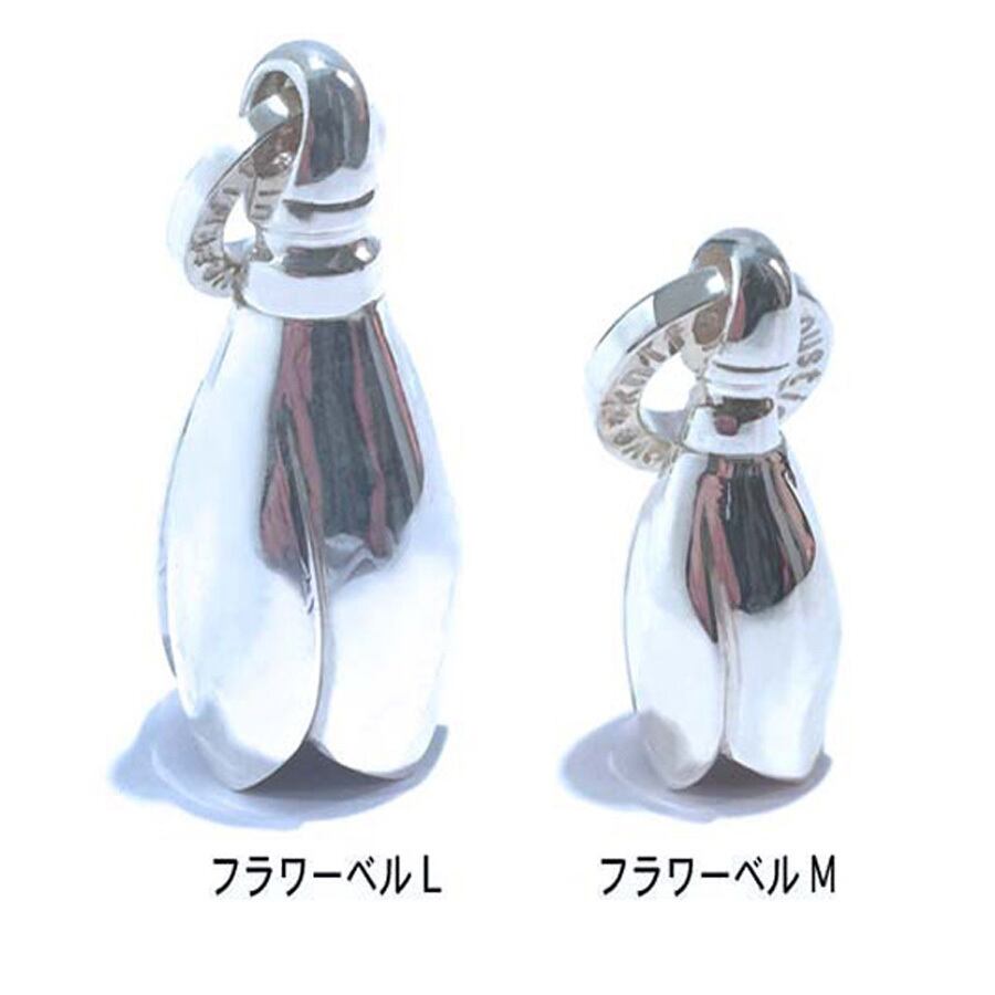 牧歌的な音色を奏でてくれる、花の蕾の形のフラワーベルのペンダントヘッドL。4つのパーツをそれぞれに仕上げてから組み立てる、とても手の込んだ作りになっています。フラワーベルのLサイズは、カランカランとのどかで牧歌的な音色を奏でます。ある程度しっかり感のある、のんびりとした音です。