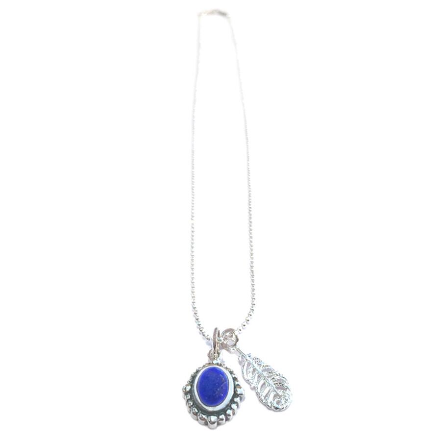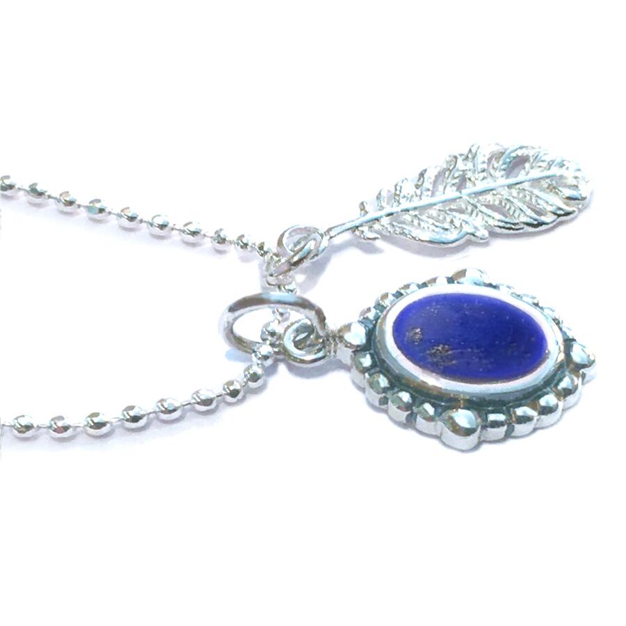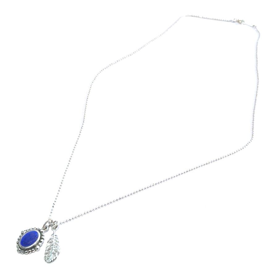 天然のラピスラズリを石枠に被せ留めし、銀の羽根/フェザーを組み合わせました。ラピスラズリは人類に認知された最古の鉱物で、まるで星空の様に美しい天然素材です。「天空を象徴する聖なる石」として神聖視され、古代エジプトでは王族などの装飾品に多く使われています。現代では、幸運をもたらすパワーストーンとして有名です。ネックレスチェーンにはキラキラのカットボールチェーンを採用し、長さをS~Lからお選び頂けます。