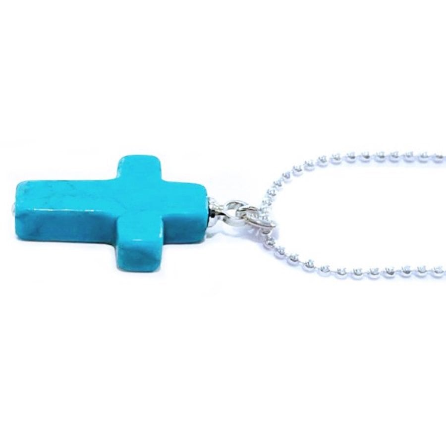 ターコイズで作ったクロスを用い、ネックレスにしました。天然の表情が豊かで、小さいながらも鮮やかなターコイズブルーを発します。ネックレスチェーンにはキラキラのカットボールチェーンを採用、長さをS~Lからお選び頂けます。留具部分には、羽根のチャームを取り付けました。ターコイズは非常に明るいポジティブなエネルギーを放ち、ネガティブなエネルギーを払いのけ、困難を乗り越え願望を叶える為のサポートをしてくれます。シルクロードの時代から、旅のお守りともされます。